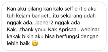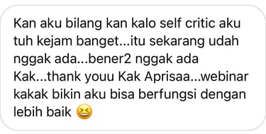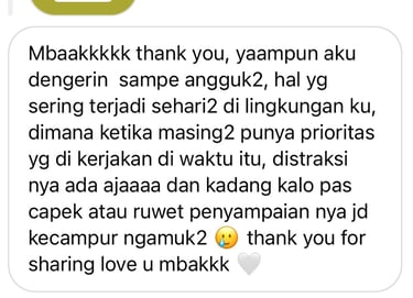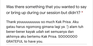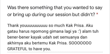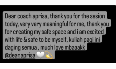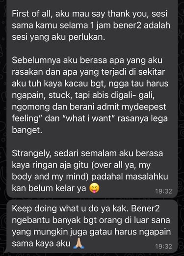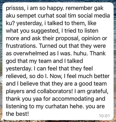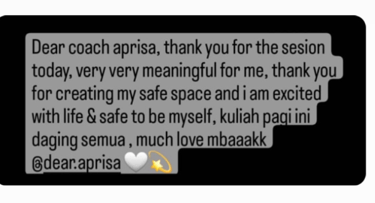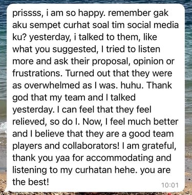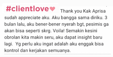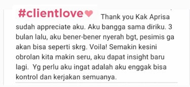 I was overwhelmed with my to-do list. I feel messy, with scattered schedule and thoughts in my head. Aprisa helped me clear my worries while being empathetic to my problems. She empowered me to pursue my next big goals and most importantly she is a very good listener. This is my first coaching experience, so actually I expected life hacks lol. Turns out, we worked together to sort things out so I can create a better life and that's great because now I appreciate myself more!