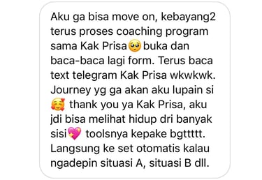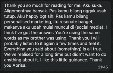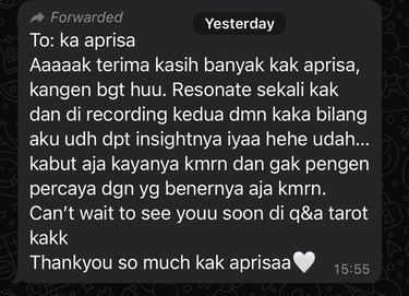 My toxic relationship back in 2022 was what I'd call a "blessing in disguise" because it brought me to Aprisa's page. I trusted her almost immediately then signed up for a private coaching. Three months later I experienced a spiritual rebirth that changed the way I lived my life. She has helped me help myself.